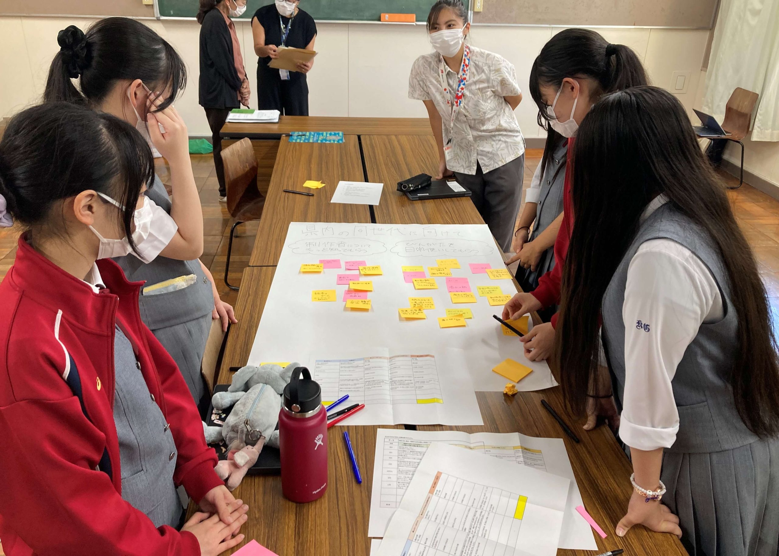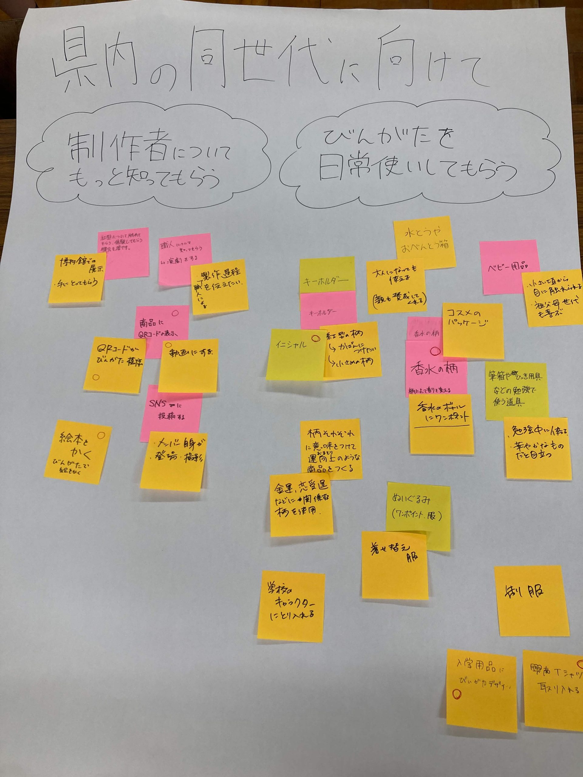 これまでのワークを振り返り、課題の整理とターゲットを設定。興南祭で実施した琉球びんがたに関するアンケート調査を踏まえ、新しい活用シーンをディスカッションしました。
