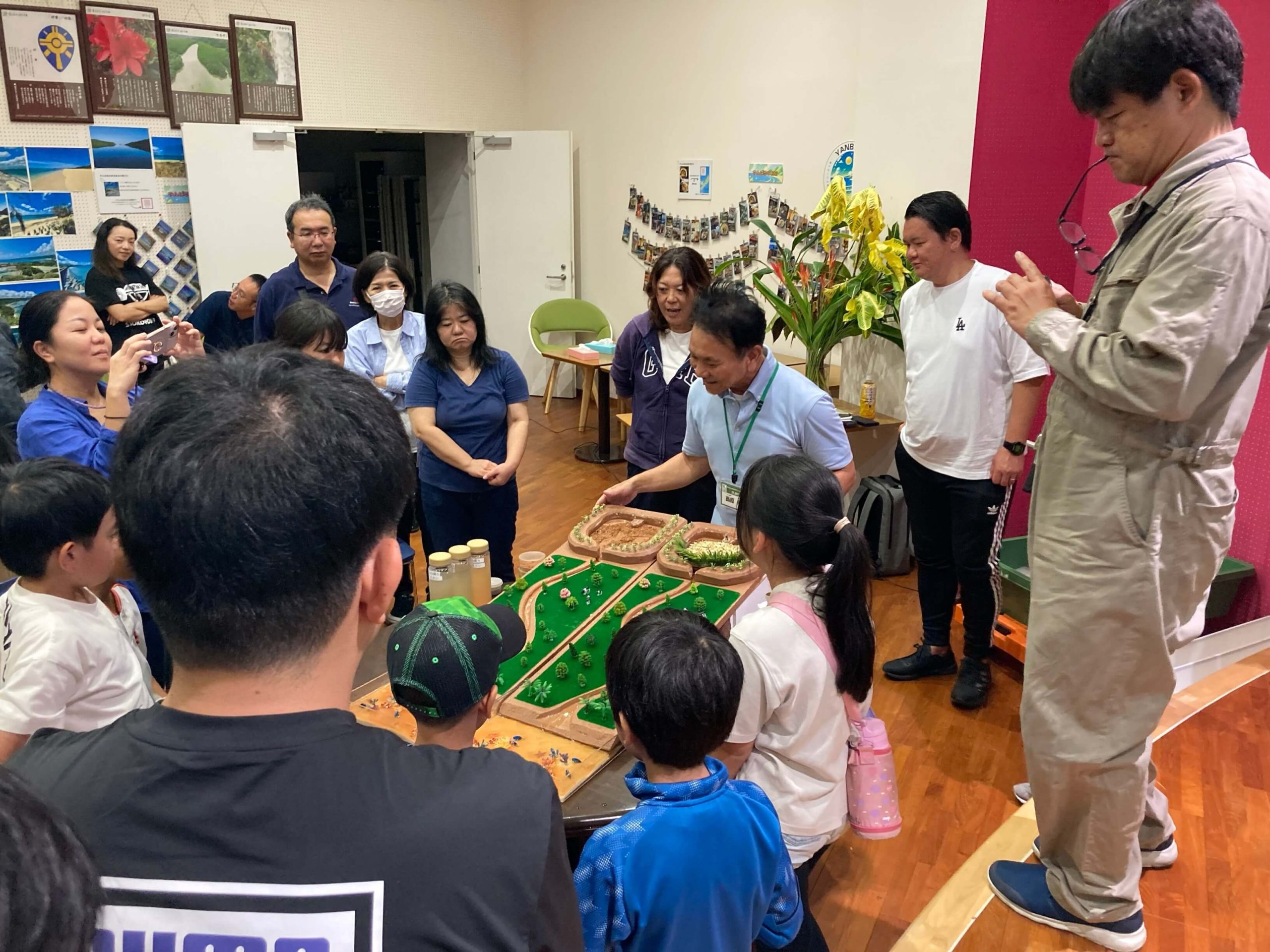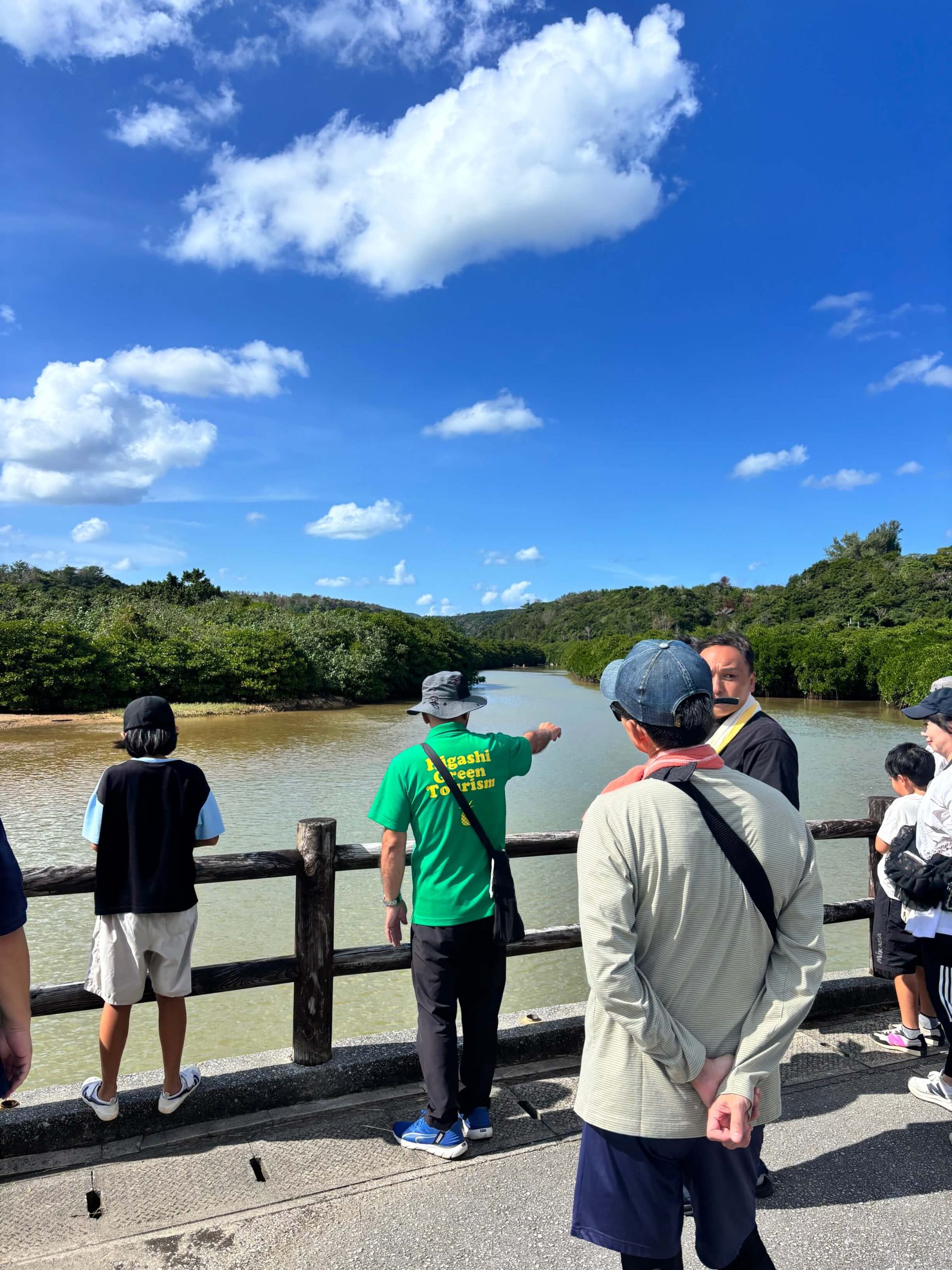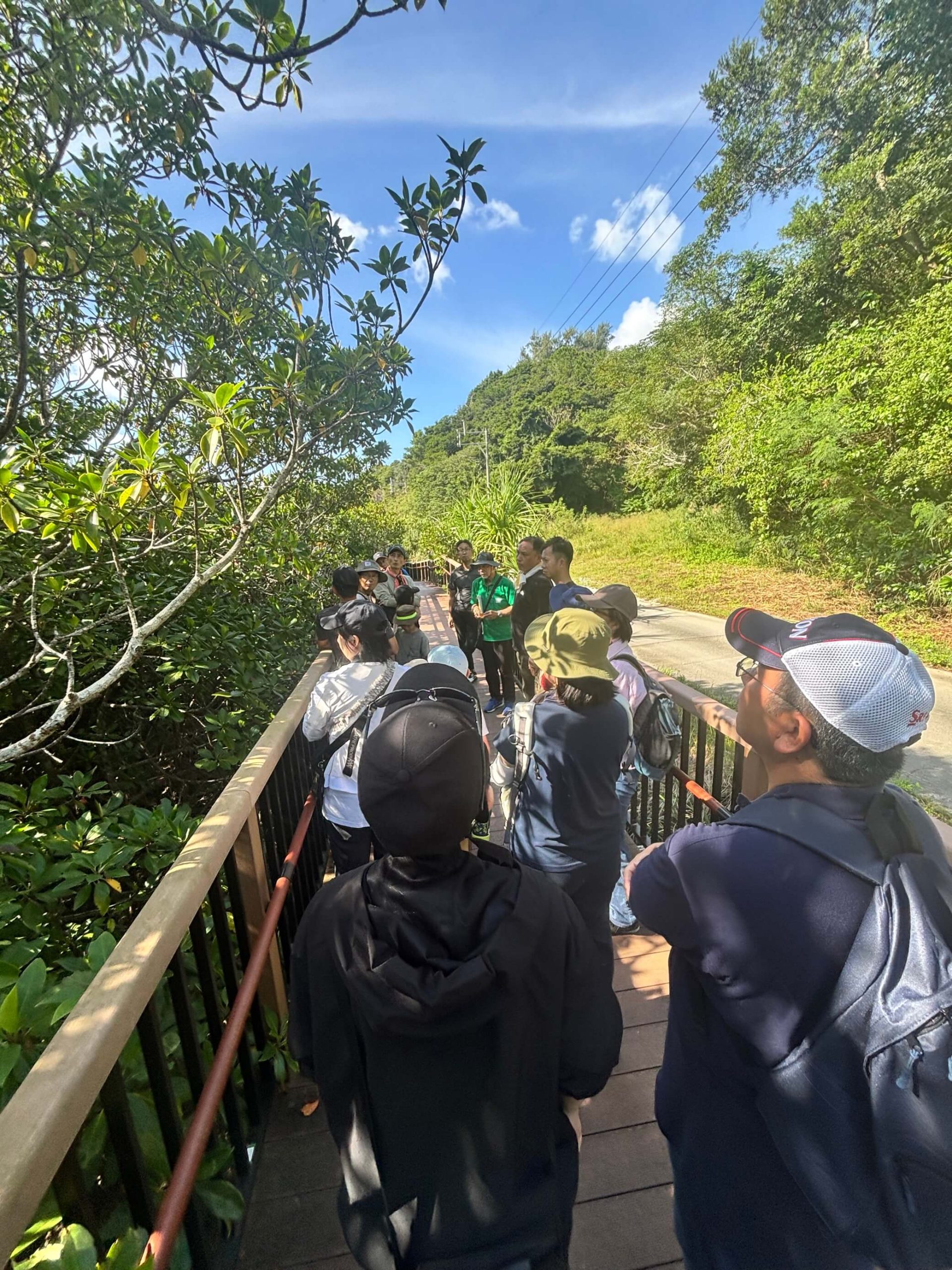 植栽活動後は皆で昼食を取り、東村ふれあいヒルギ公園に移動。国指定天然記念物である「慶佐次(げさし)湾のヒルギ林」が広がる園内遊歩道を、ガイドの案内のもと散策しました。