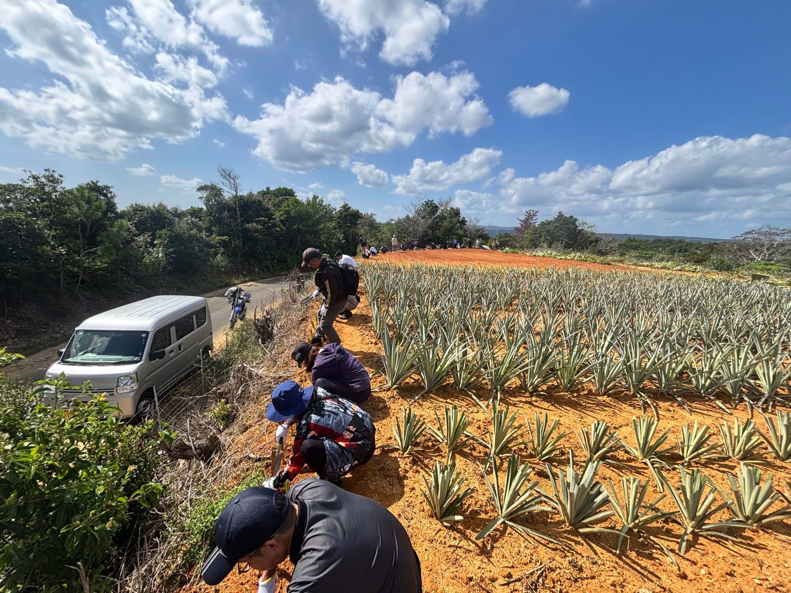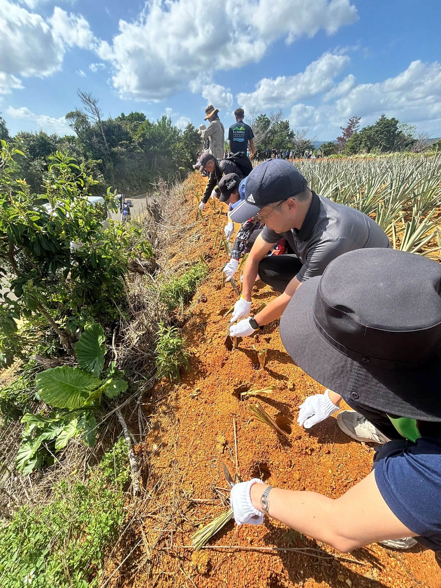 今回支援したのはファームテックアキさんのパイン畑です。約5,000平方メートルの農地周辺に約700本のベチバーを植栽しました。