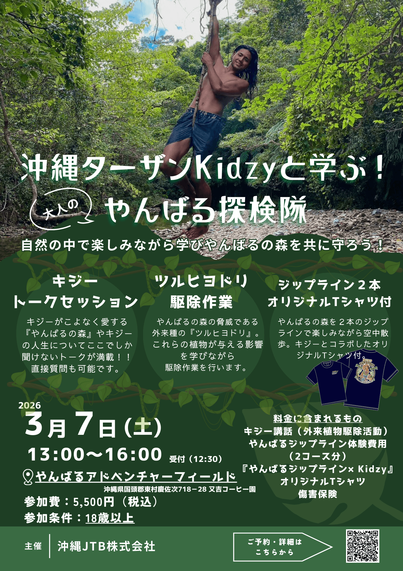 沖縄本島北部・東村の『やんばるジップライン』にて、アンバサダーである 「Kidzy(キジー)」さんとともに、サステナビリティ/エコをテーマとしたイベント「沖縄ターザンKidzyと学ぶ!大人のやんばる探検隊」を開催いたします。