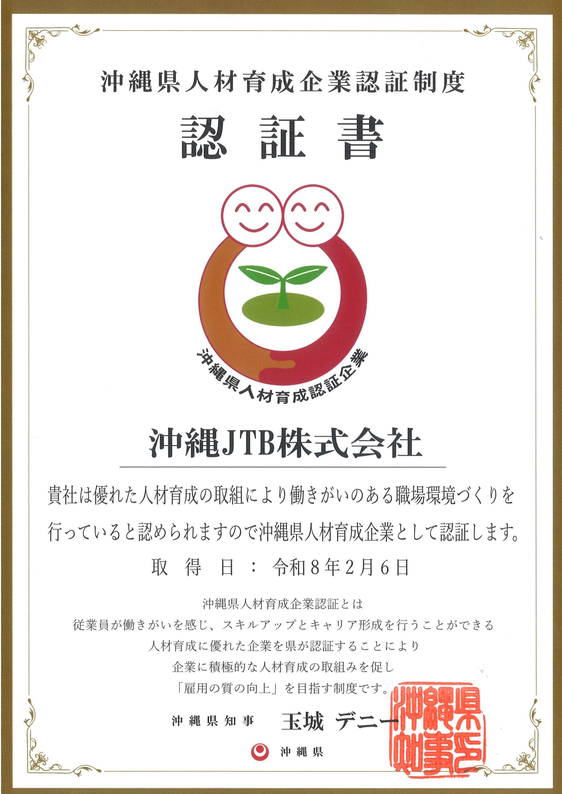 沖縄JTB株式会社は、沖縄県より「沖縄県人材育成企業認証制度」の認証基準を満たしている企業として認められました。